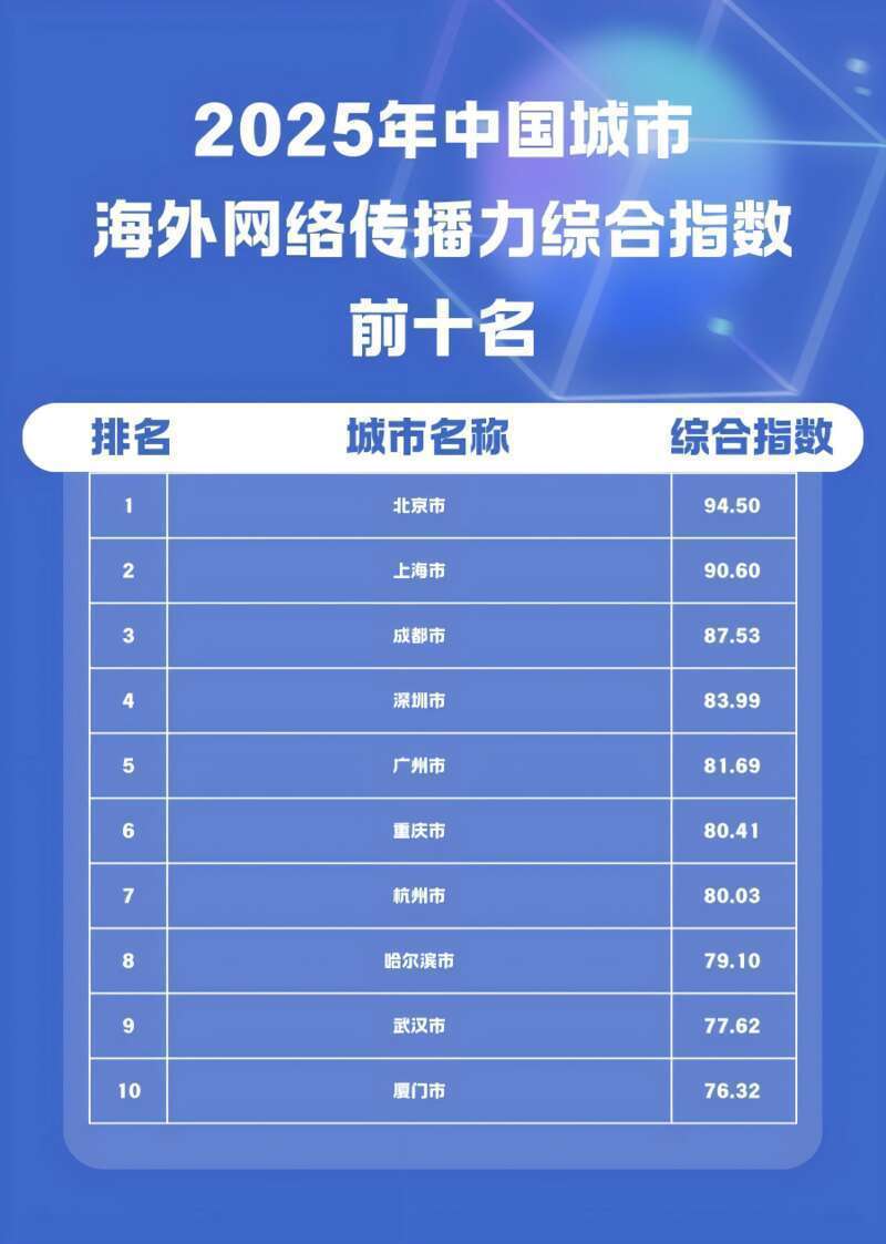 《2025中国城市海外网络传播力建设报告》显示,2025年中国338座城市(自治州、地区、盟)海外网络传播力综合指数前十名依次是:北京市、上海市、成都市、深圳市、广州市、重庆市、杭州市、哈尔滨市、武汉市、厦门市。
