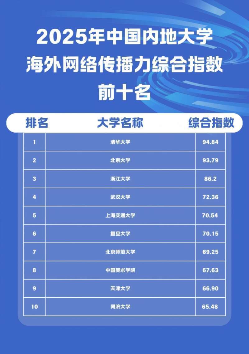《2025中国大学海外网络传播力建设报告》显示,2025年中国193所大学海外传播力综合指数排名前十名的大学依次为:清华大学、北京大学、浙江大学、香港科技大学、香港大学、香港理工大学、香港城市大学、武汉大学、台湾大学、上海交通大学。
