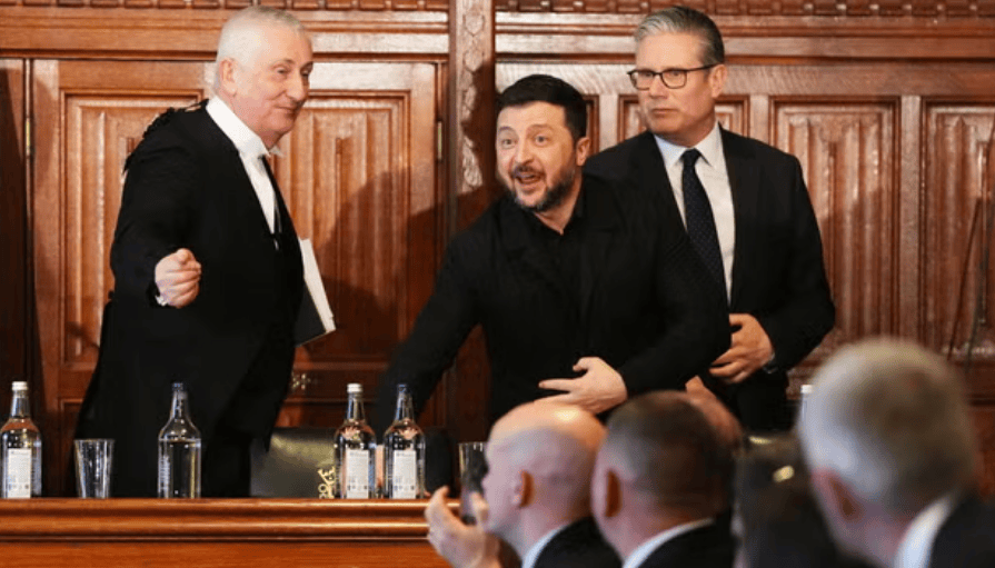 他将一台能实时显示俄罗斯境内所有无人机袭击、步兵行动、来袭导弹袭击以及远程空袭等重要信息的顶级机密设备赠予了英国国王,随后他前往议会,受到了议员们的长时间鼓掌欢迎。